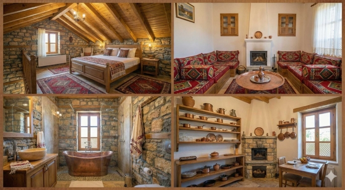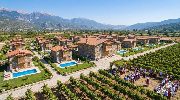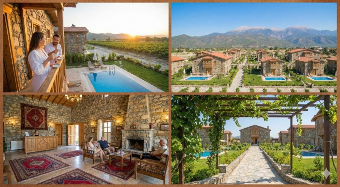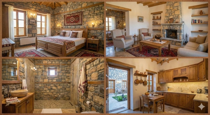 Konsept: Taş mimari ve ahşap detaylarla bezeli, doğaya saygılı konaklama üniteleri.