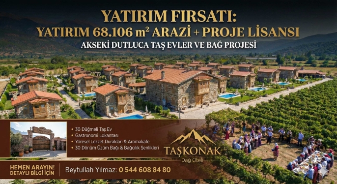 Antalya’nın kitle turizminden "deneyim turizmine" evrildiği yeni çağda, Akseki Dutluca’nın bakir doğasında, 68.106 m²’lik devasa bir "Kırsal Turizm Tesis Alanı" arazisi, üzerindeki "Taşkonak Dağ Oteli" proje konseptiyle birlikte vizyoner sahibini arıyor.