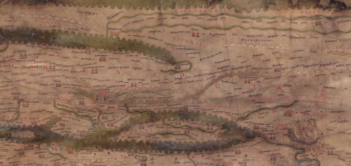 Haritanın alt kısmında görülen büyük nehir, büyük olasılıkla Tuna Nehri'dir (Latince: Danubius veya Ister).