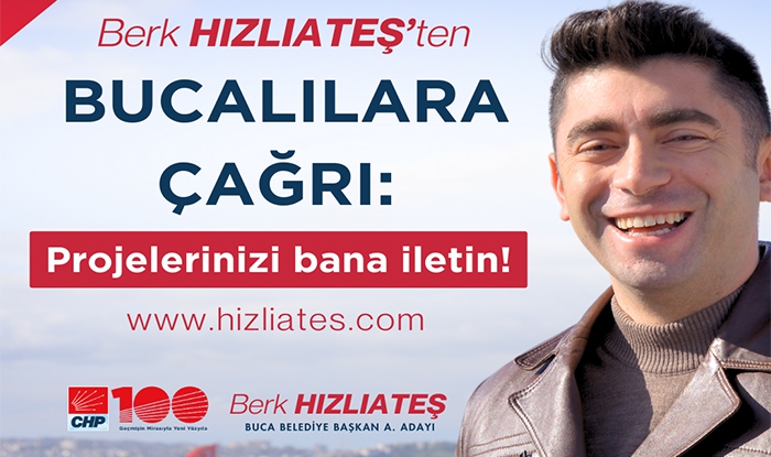 31 Mart Yerel seçimleri için aday adaylarının saha çalışmaları devam ederken İzmir’in genç adaylarından CHP Buca Belediye Başkan aday adayı Berk Hızlıateş yaratıcı bir uygulamayı hayata geçirdi. Bucalılara çağrıda bulunan Hızlıateş seçim kampanyası için oluşturulan www.hizliates.com internet sitesindeki formu doldurarak vatandaşların proje fikirlerini kendisine iletebileceğini söyledi.