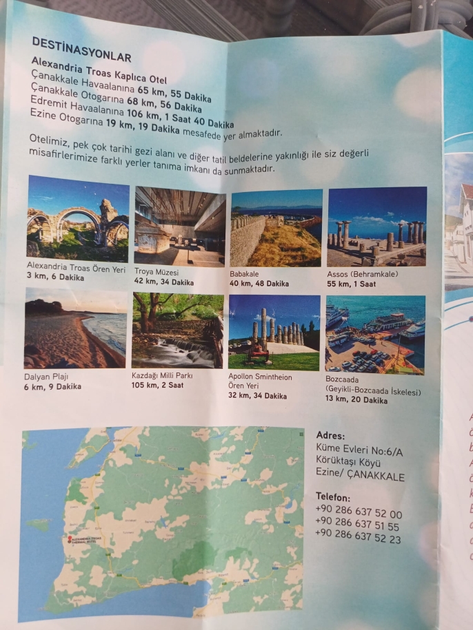 Alexandria Troas Kaplıca Oteli, sadece bir sağlık merkezi değil, aynı zamanda Kuzey Ege'nin tarihi ve turistik güzelliklerini keşfetmek için harika bir lokasyona sahip. Otelin bazı önemli turistik noktalara mesafesi şöyle: