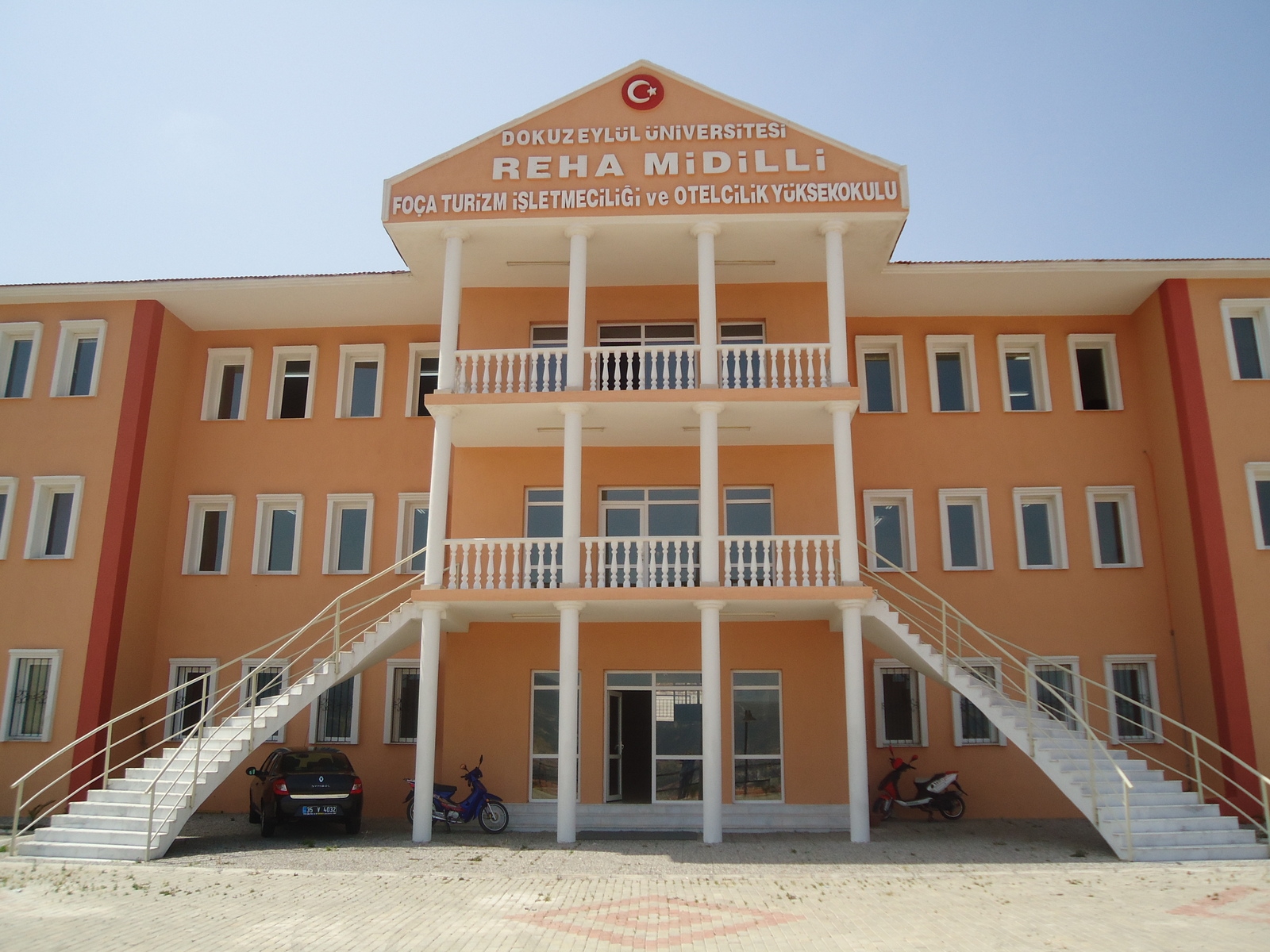 Arazisi hazineye ait olan yer üzerine yapılan protokolle Foçalı hayırsever Reha Midilli 2008 yılında tam donanımlı bir okul binası yaptı. Bina; eğitim dışında hiçbir faaliyette kullanılamayacağı koşuluyla Dokuz Eylül Üniversitesi’ne devredildi. Foça Atatürk Mahallesi Denizkent yerleşim bölgesindeki binada 2009 yılında Foça Turizm İşletmeciliği ve Otelcilik Yüksekokulu adıyla eğitime başlandı. 2010 yılında okulun adı Reha Midilli Foça Turizm İşletmeciliği ve Otelcilik Yüksekokulu olarak değiştirildi. 2014 yılında Bakanlar Kurulu kararıyla yüksekokul kapatılarak yerine Reha Midilli Foça Turizm Fakültesi kuruldu. 2020 yılında Dokuz Eylül Üniversitesi Yönetim Kurulu Fakültenin Tınaztepe kampüsüne taşınmasına ve Dokuz Eylül Turizm Fakültesi adıyla eğitime devam etmesini kararklaştırıldı. Bu kararla üç yıl önce boşaltılan Foça’daki bina adeta çürümeye terkedildi.