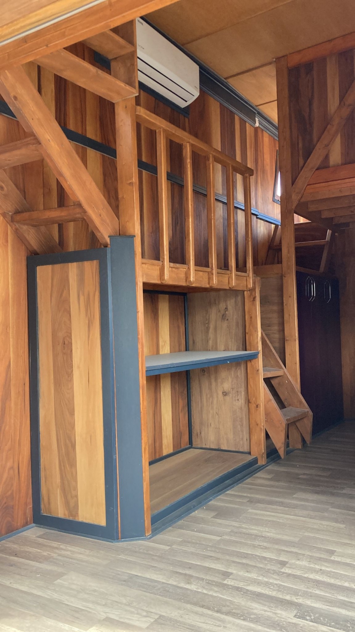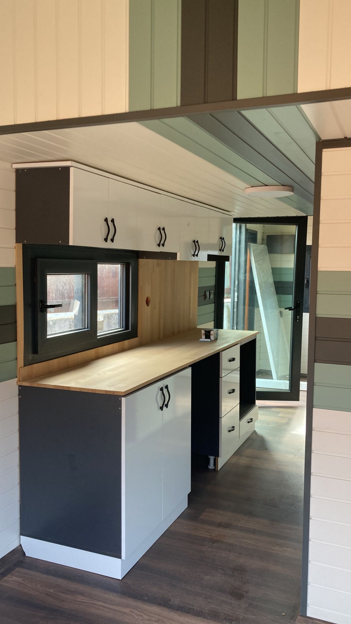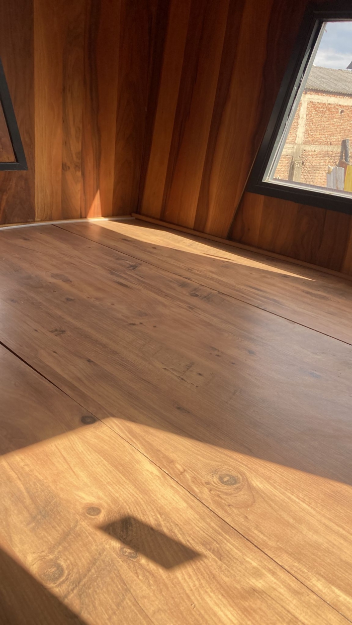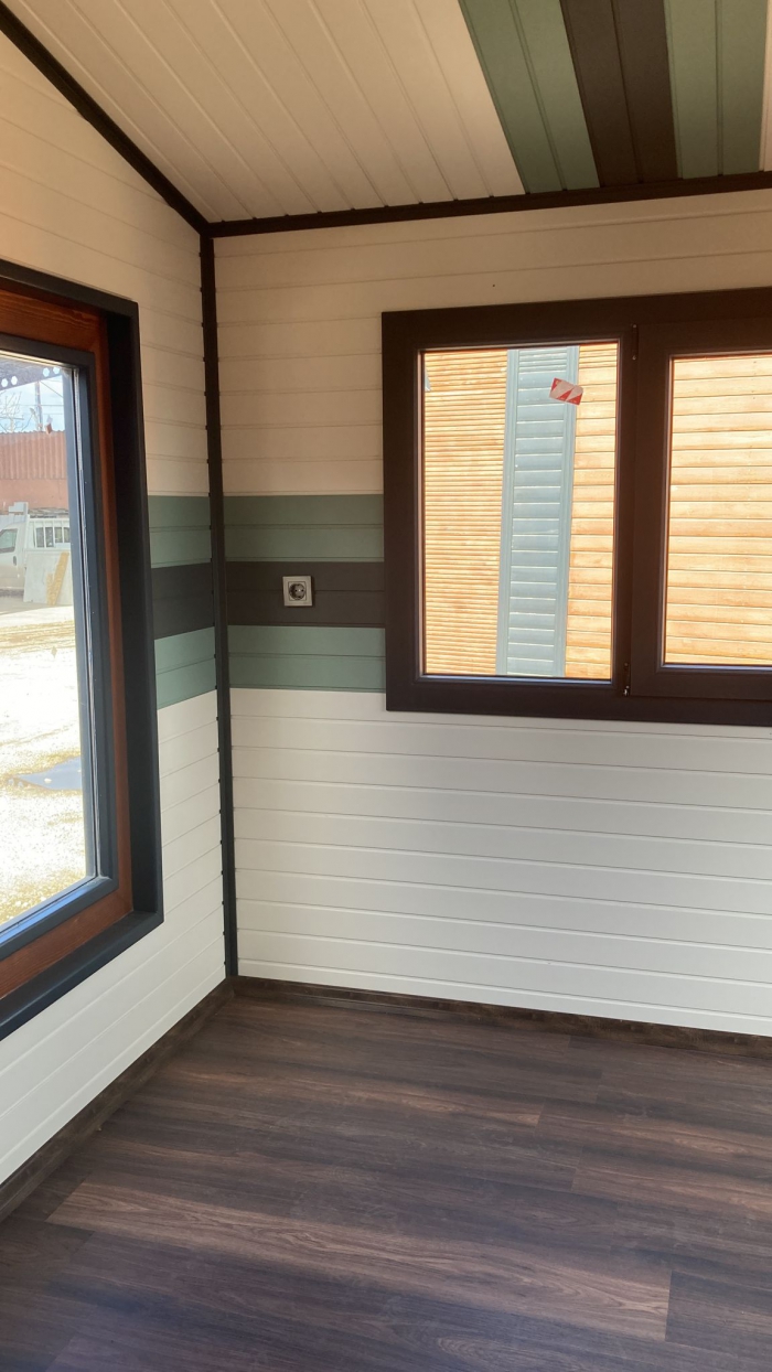 Tinyhouse'un iç donanım özellikleri de oldukça zengin ve konforludur. Elektrik tesisatı, lavabo, tuvalet, banyo ve mutfak gibi temel yaşam alanları bu tasarıma dahildir. Bu özellikler, Tinyhouse'un minimal boyutlarına rağmen fonksiyonel bir yaşam alanı sunar. Dursunbey çamı ise bu yapıya katkı sağlayarak, iç mekanın sıcak ve doğal bir atmosferle donatılmasını mümkün kılar. Ahşap dokusunun doğal yapısı, Tinyhouse'un iç mekanında hem görsel bir zenginlik hem de sıcaklık yaratır.