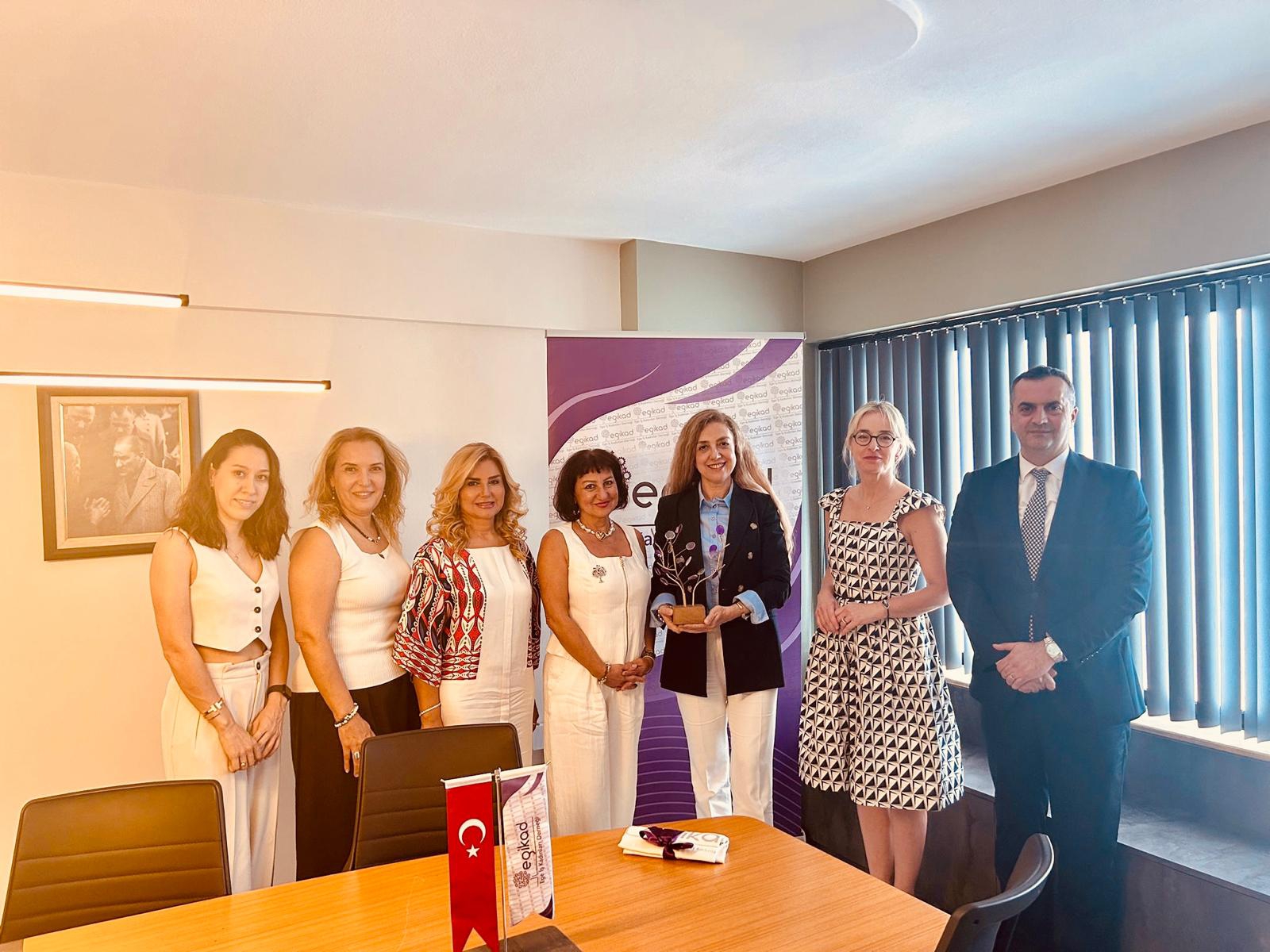 Dışişleri Bakanlığı İzmir Temsilcisi Yeşim Kebapçıoğlu ile Dışişleri Bakanlığı Avrupa Birliği Başkanlığı İzmir Temsilciliği’nden Dr. Öğr. Üyesi Volkan Kocagül, Ege İş Kadınları Derneği’ne (EGİKAD) nezaket ziyaretinde bulundu. Ziyaret kapsamında, EGİKAD’ın bugüne kadar yürüttüğü ve paydaşı olduğu Avrupa Birliği projeleri hakkında detaylı bilgiler paylaşıldı.