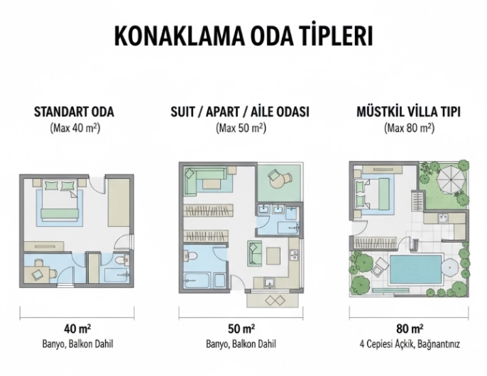 Önemli İstisna: Eğer projeniz, dört cephesi açık, birbiriyle fiziksel bağlantısı olmayan ve tek bir konaklama birimi içeren müstakil bir yapı (villa tipi) ise, bu alan 80 m²'ye kadar çıkabiliyor. Bu, özellikle lüks ve izole bir tatil deneyimi sunmak isteyen yatırımcılar için önemli bir fırsat.