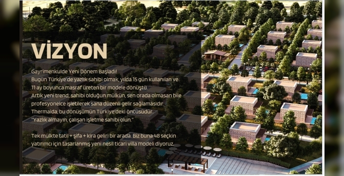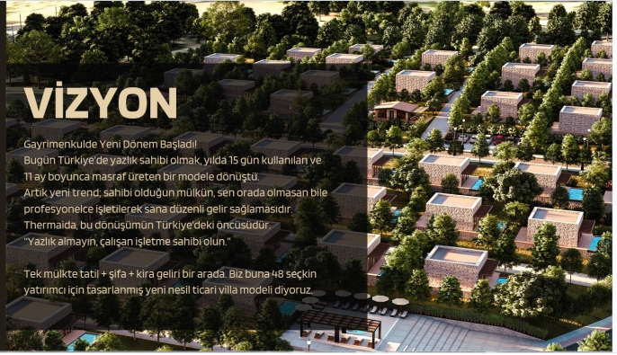 S: Thermaida'da tapu tipi nedir, bireysel tapu mu veriliyor? C: Hayır, bireysel "kat mülkiyeti" değil; termal turizm imarlı arazide "arsa paylı tapu" veriliyor. Yatırımcı, arazinin ve projenin hisseli maliki oluyor, kendisine tahsisli "bağımsız birim" (villa) kullanım hakkına sahip oluyor.