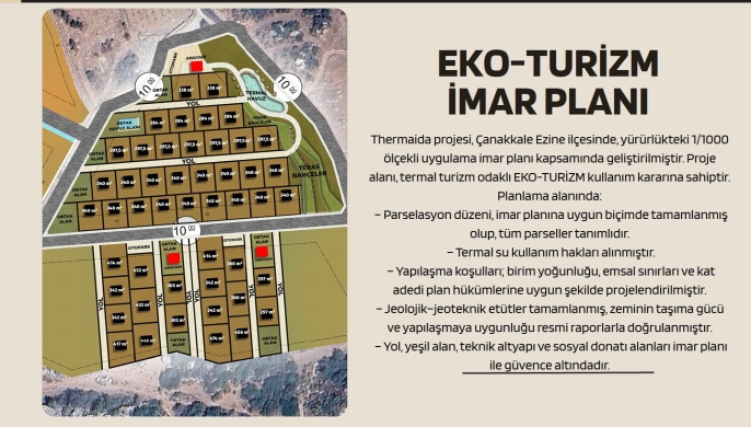 S: İmar durumu nedir? C: Proje alanı, 1/1000 ölçekli uygulama imar planında "EKO-TURİZM" kullanım kararına sahiptir. Tüm parseller tanımlı ve termal ruhsatlıdır.