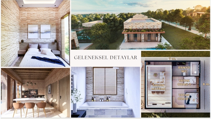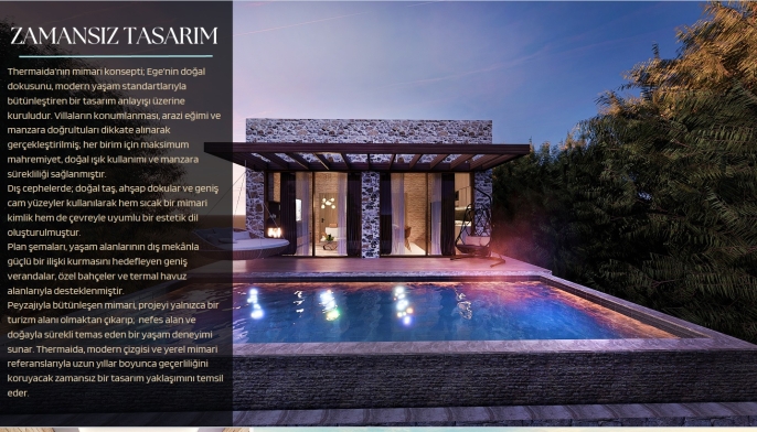 "Bağımsız birimler", Ege mimarisinin modern yorumuyla tasarlanmıştır. Doğal taş ve ahşap cepheler, geniş verandalar ve her birime özel termal havuzlar, bu birimlerin standart bir yazlıktan ziyade lüks bir otel süiti (villa) olarak kurgulandığını kanıtlar. Toplamda sadece 48 adet olan bu birimler, butik ve niş bir yatırım fırsatı oluşturur.