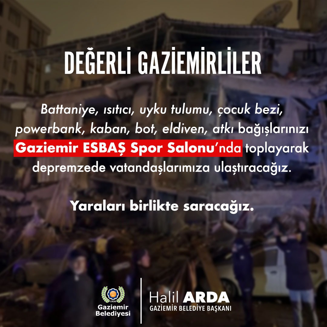 Sosyal medya hesabı üzerinden kampanyayı duyuran Gaziemir Belediye Başkanı Halil Arda, “Değerli Gaziemirliler, acımız büyük. Battaniye, ısıtıcı, uyku tulumu, çocuk bezi, powerbank, kaban, bot, eldiven, atkı bağışlarınızı Gaziemir ESBAŞ Spor Salonu’nda toplayarak depremzede vatandaşlarımıza ulaştıracağız. Yaraları birlikte saracağız” dedi.