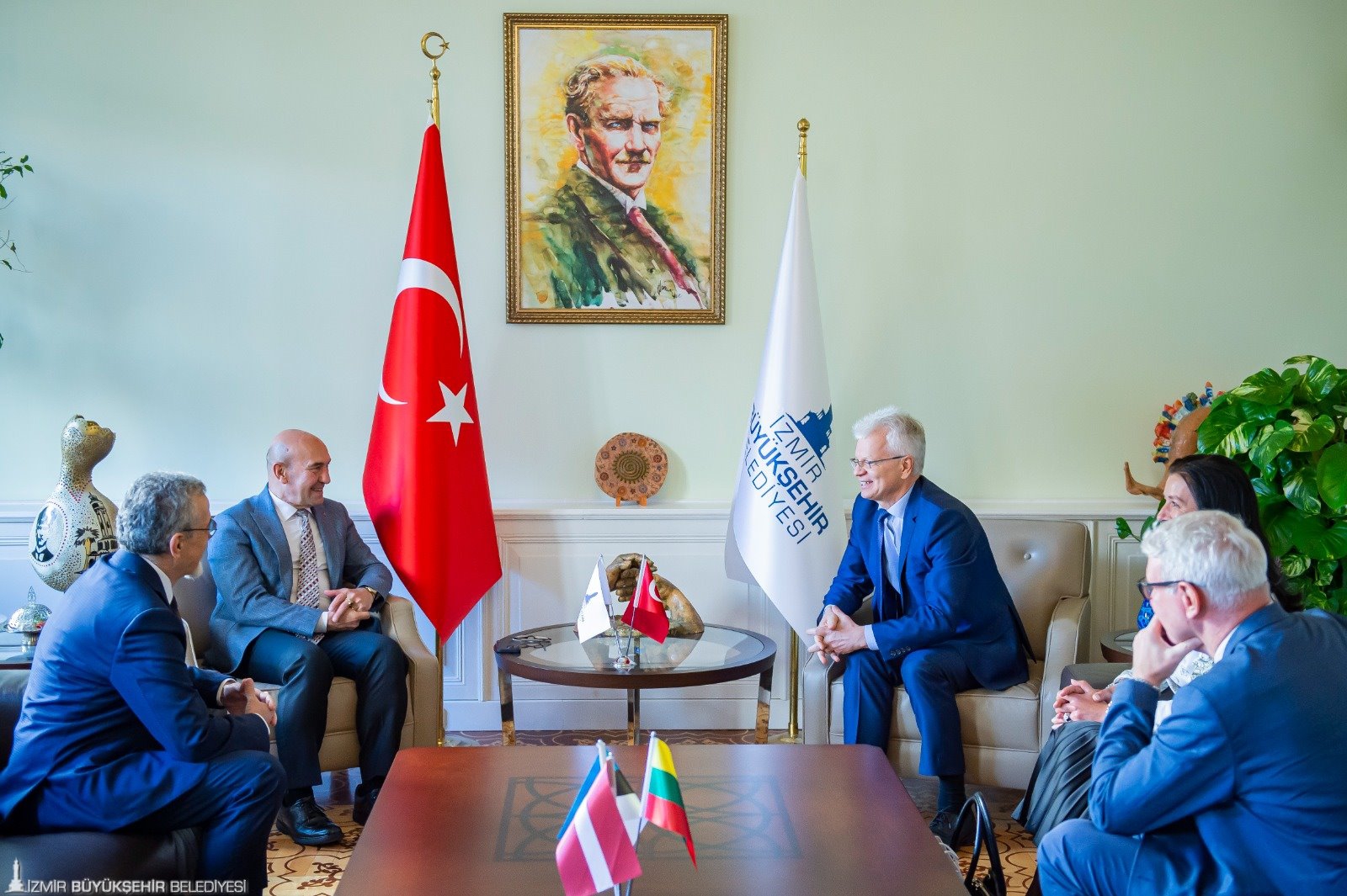 İzmir Büyükşehir Belediye Başkanı Tunç Soyer, bir dizi ziyaret için kente gelen Litvanya Ankara Büyükelçisi Ricardas Degutis, Letonya Ankara Büyükelçisi Peteris Vaivars ve Estonya Ankara Büyükelçisi Annely Kolk ile İzmir Litvanya Fahri Konsolosu Mustafa Ahmet Özsoy’u Egemenlik Evi’ndeki makamında konuk etti.