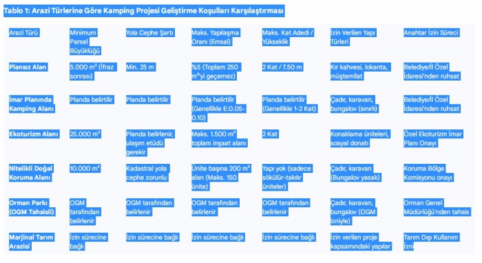 - Sit Alanları: Doğal güzellikleri nedeniyle cazip olan bu alanlar, en katı koruma rejimlerine tabidir. "Kesin Korunacak Hassas Alan" (eski 1. Derece Sit) statüsündeki yerlerde kamping dahil her türlü yapılaşma yasaktır . "Nitelikli Doğal Koruma Alanı" (eski 2. Derece Sit) statüsündeki yerlerde ise çok sıkı koşullar altında kamping tesisine izin verilebilir. Bu koşullar arasında minimum 10.000 metrekare parsel büyüklüğü, kampçı ünitesi başına en az 200 metrekare alan ayrılması ve bu alanlarda bungalov yapılmasının kesinlikle yasak olması gibi net sınırlamalar bulunmaktadır .