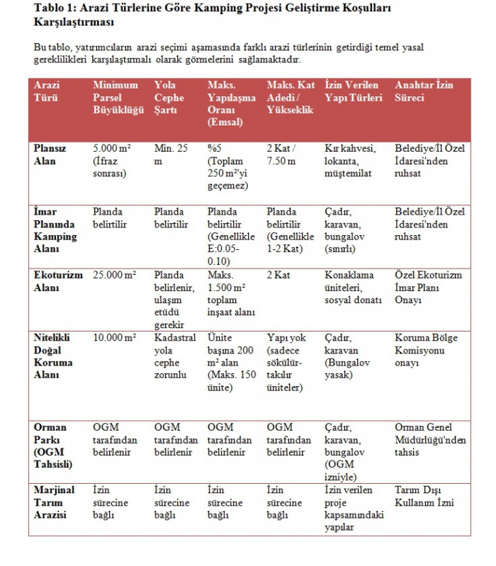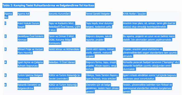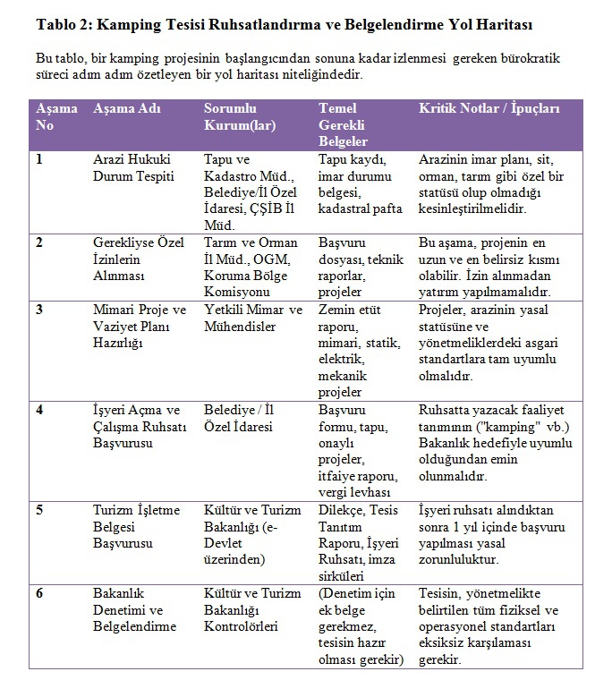 Turizm İşletme Belgesi düzenler. Bu nedenle, projenin nihai hedefi ne ise, en başından o hedefe uygun, doğru ve net ibareyi içeren bir ruhsat almak hayati önem taşır. Örneğin, "günübirlik tesis" ruhsatı alıp sonradan konaklama birimleri ekleyerek "kamping belgesi" talep etmek mümkün değildir .