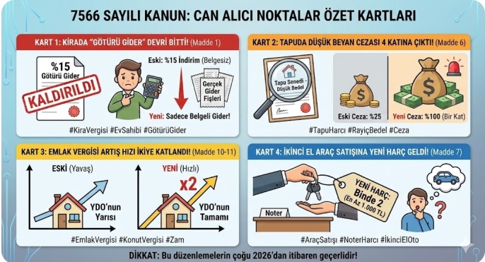 Yürürlük Notu: Kanunun emlak, tapu ve harçlarla ilgili çoğu maddesi 1 Ocak 2026 tarihinde, diğer bazı idari maddeler ise yayımı tarihinde (bugün) yürürlüğe girmektedir.