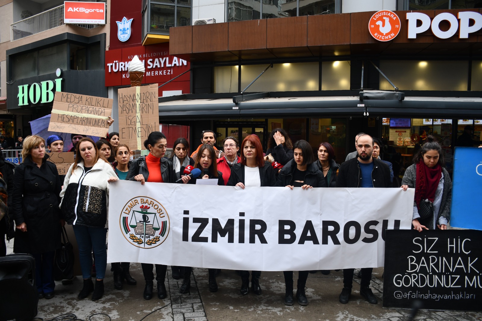 Alsancak Türkan Saylan Kültür Merkezi önünde yapılan ve "Susma haykır yaşamak haktır", "Zincirleri kır kafesleri parçala", "Kan kokuyor barınaklarınız kan kokuyor" sloganlarının atıldığı açıklamayı İzmir Barosu Hayvan Hakları Komisyonu üyesi Av. Tuğçe Berber okudu.