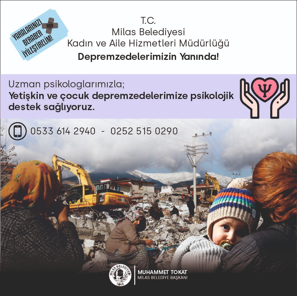 Milas Belediyesi Kadın ve Aile Hizmetleri Müdürlüğü, deprem mağduru vatandaşlara yönelik; psikolog, psikolojik danışman ve aile danışmanından oluşan ekiple psikososyal destek hizmeti sunmaya başladı.