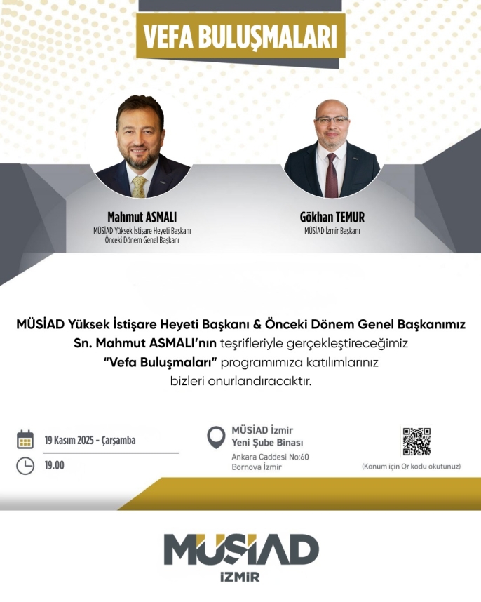 MÜSİAD İzmir Şubesi, geçmişin tecrübesini geleceğin vizyonuyla buluşturduğu "Vefa Buluşmaları" serisinin ikincisine hazırlanıyor. MÜSİAD Yüksek İstişare Heyeti Başkanı Mahmut Asmalı’nın katılımıyla gerçekleşecek zirvede, Türkiye’nin ekonomik dönüşümü ve iş dünyasının yeni yol haritası masaya yatırılacak.