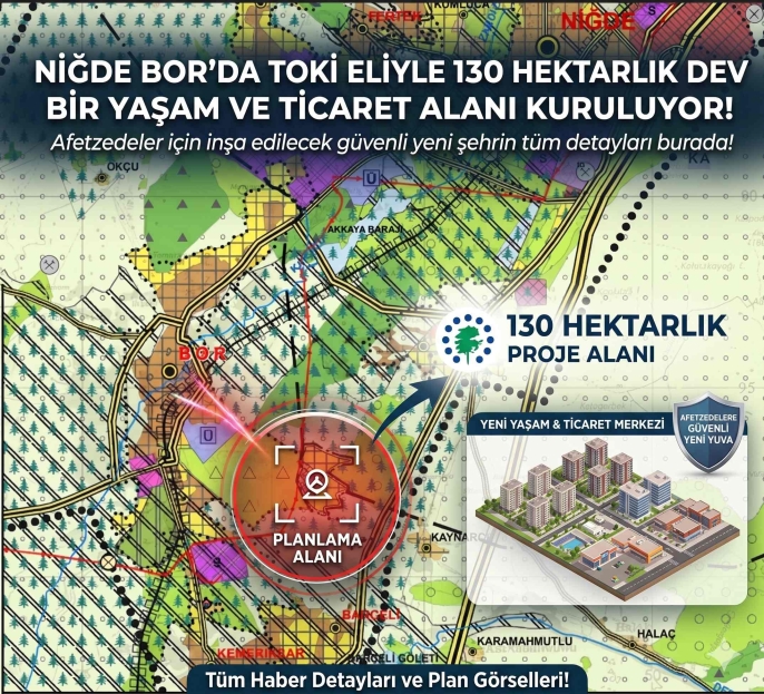 Niğde'nin Bor ilçesi Kaynarca Mahallesi'nde dev bir kentsel dönüşüm başlıyor. 6 Şubat depremlerinin ardından afetzedeler için güvenli yerleşim alanları oluşturma hedefiyle, TOKİ mülkiyetindeki yaklaşık 130 hektarlık alanın imar planı değiştirilerek yepyeni bir yaşam ve ticaret merkezine dönüştürülüyor.