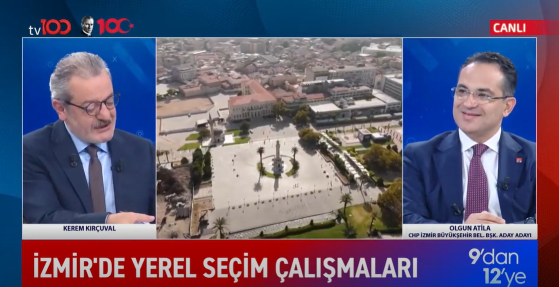 İzmir Büyükşehir Belediye Başkan Aday Adayı Olgun Atila; TV 100 ekranlarına yayınlanan 9’dan 12’ye programında Kerem Kırçuval’ın sorularını yanıtladı. ‘Kendi yaptığımız araştırmalarda da, sokaktan ve partimizden aldığımız güçle, İzmir’de en yüksek oyu alabilecek, adayda iş birliğini sağlayabilecek, toplumun bütün siyasi renklerini bir araya getirebilecek özelliğimiz ve ekibimiz olduğunu biliyoruz.’’ diyerek sözlerine başlayan Atila, neden İzmir Büyükşehir Belediyesi’ne aday olduğunu ‘’Sayın genel başkanımız Özgür Özel’in yoluna yoldaş olmak için yola çıktık. Bunun için geçmişteki birikimlerimizi, deneyimlerimizi, kendi ilçemizde yapmış olduğumuz özel projelerin daha iyilerini şimdi güzel İzmir’imize kazandırmak, İzmirli hemşerilerimizle ortak akılla yönetebilmek için aday olmaya karar verdik. ‘’ sözleri ile ifade etti. Bornova belediye başkanlığı döneminde yapılan anketlerde ‘En başarılı ilçe belediye başkanı’ gösterildiği halde aday olmadığını söyleyen Atila, partisine asla küsmeyip her zaman İzmir için daha çok çalışmaya devam ettiğini belirterek, Cumhuriyet Halk Partisi içindeki değişim hareketinin Türkiye’de bir değişim hareketine öncülük edeceğini ve kendisinin de bunun bir parçası olmaktan onur duyacağını dile getirdi.