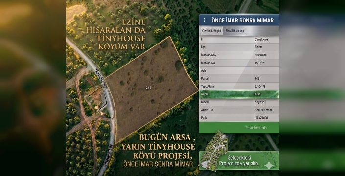 Son yılların en cazip yatırım ve yaşam trendi olan "Tiny House" (Küçük Ev) konsepti, Çanakkale'nin tarihi ve doğasıyla büyüleyen ilçesi Ezine'de, Hisaralan Köyü'nde yepyeni bir boyuta taşınıyor. Yıllar önce tüm resmi ekoturizm imar süreçleri tamamlanmış olan, yasal güvencesi tam 16 bağımsız birimlik dev proje, yatırımcılarını bekliyor. Proje Koordinatörü Beytullah Yılmaz'ın öncülüğünde yürütülen bu özel çalışma, "Önce İmar, Sonra Mimar" felsefesiyle güvenli ve huzurlu bir yaşamın kapılarını aralıyor.