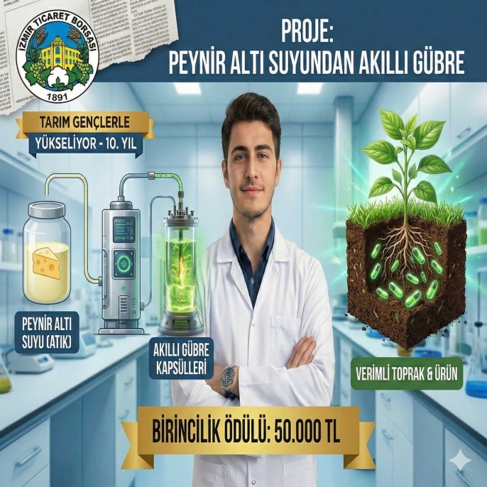 İzmir Ticaret Borsası (İTB) tarafından bu yıl 10.’su düzenlenen "Tarım Gençlerle Yükseliyor" yarışması sonuçlandı. Tarımsal atıkları ekonomiye kazandıran ve yapay zeka destekli çözümler sunan projelerin yarıştığı finalde, peynir altı suyunu akıllı gübreye dönüştüren proje birincilik koltuğuna oturdu. Gençlerin tarıma olan ilgisini artırmayı hedefleyen yarışmada ödül miktarları da güncellendi.