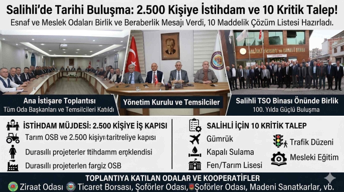 Salihli Ticaret ve Sanayi Odası (TSO) öncülüğünde bir araya gelen esnaf ve meslek odalarının başkanları, ilçenin kalkınması için önemli kararlara imza attı. Tam kadro gerçekleştirilen toplantıda hem dev istihdam projesinin müjdesi verildi hem de Salihli'nin acil çözüm bekleyen sorunları için 10 maddelik bir manifesto hazırlandı.