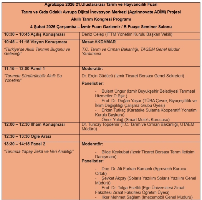 Dünyanın sayılı tarım fuarlarından biri olan AgroExpo, bu yıl teknoloji odaklı vizyonuyla öne çıkıyor. 4 Şubat 2026 Çarşamba günü, İzmir Fuarı Gaziemir B Fuaye Seminer Salonu’nda gerçekleşecek olan Akıllı Tarım Kongresi, saat 10.30’da İTTM Yönetim Kurulu Başkan Vekili Deniz Celep’in açılış konuşmasıyla start alacak.