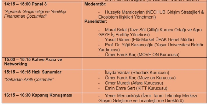 Teknolojik fikirlerin ticari ürüne dönüşmesi için gereken finansal modeller, NEOHUB Girişim Stratejileri Yönetmeni Huzeyfe Maralceylan moderatörlüğündeki "Agritech Girişimciliği ve Yenilikçi Finansman Çözümleri" panelinde masaya yatırılacak. Panelistler arasında Yaşar Üniversitesi Rektör Yardımcısı Prof. Dr. Yiğit Kazançoğlu, Taze Süt Çiftliği Kurucusu Murat Bolat, ElüsMarket ÜPAK Genel Müdürü Yusuf Dümen ve MOVE ON Kurucusu Ömer Faruk Koç bulunuyor.
