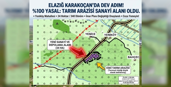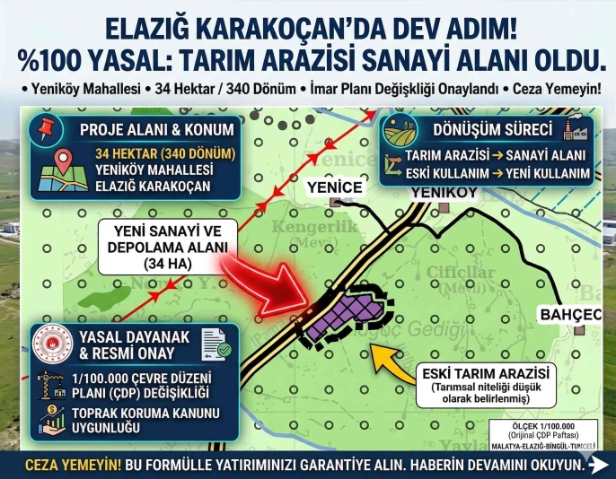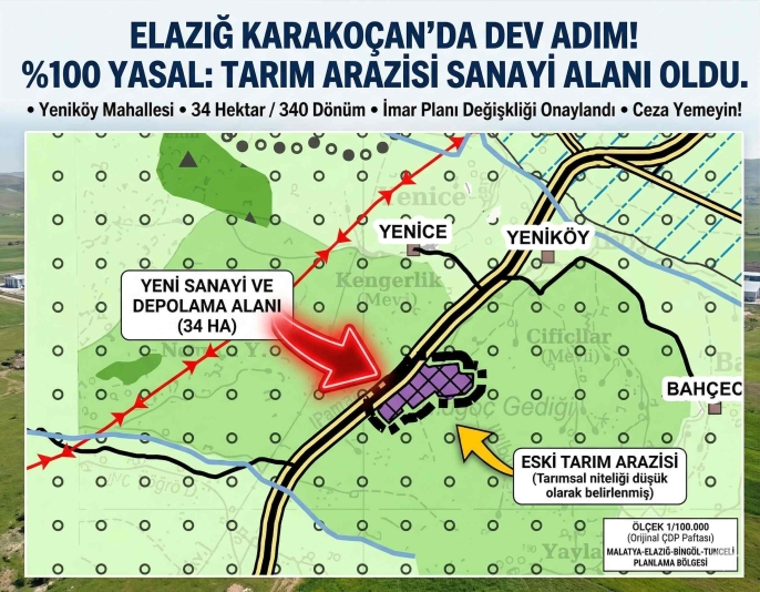 Çevre, Şehircilik ve İklim Değişikliği Bakanlığı, Elazığ’ın Karakoçan ilçesinin ekonomik kaderini değiştirecek çok kritik bir plan değişikliğine imza attı. Yeniköy Mahallesi'nde bulunan yaklaşık 34 hektarlık (340 dönüm) devasa tarım alanı, resmen "Sanayi ve Depolama Alanı" ilan edildi.