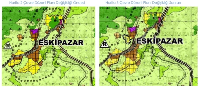 Tarım Arazisinden Kentsel Gelişmeye Zonguldak-Bartın-Karabük Planlama Bölgesi 1/100.000 Ölçekli Çevre Düzeni Planı’nda daha önce "Tarım Arazisi" olarak görünen alan, yapılan değişiklikle "Kentsel Gelişme Alanı" olarak düzenlendi. Karabük İl Tarım ve Orman Müdürlüğü tarafından yapılan incelemede, arazinin bitkisel üretim için uygun olmayan "hali arazi" (H sınıfı) olduğu tespit edilerek tarım dışı kullanımına onay verildi.