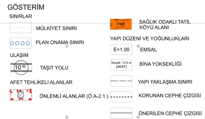 Turizm Tesis Alanları: Bu alanlarda yapılacak tesisler için emsal (E) 0.70 ve maksimum yükseklik (hmax) 10.50 m (5 kat) olarak belirlenmiştir.