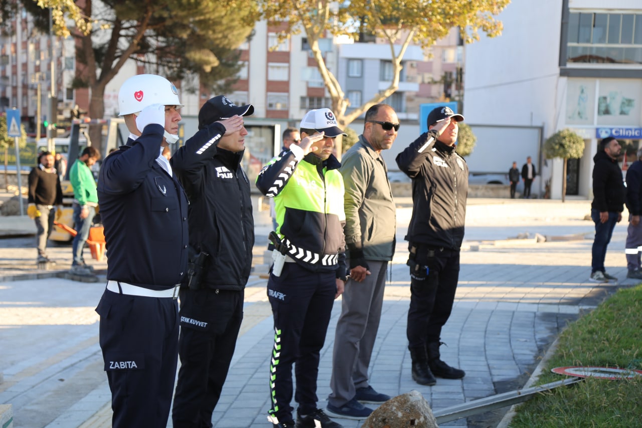 Saatler 09.05’i gösterdiğinde 2 dakikalık saygı duruşunda bulunuldu ve sirenler çaldı. Çok sayıda vatandaşta, araçlarının kornalarını 2 dakika boyunca çalarak, saygı duruşunda bulundu. Ardından İstiklal Marşı söylendi.