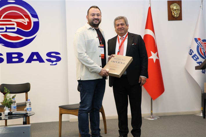 FOTOĞRAF ALTI: YABİSAK Başkanı Dr. Faruk Güler, Endeavor Türkiye Yönetim Kurulu Üyesi Koray Gültekin Bahar’a ve panelistlere Homeriç Landscape Smyrna kitabını hediye etti.